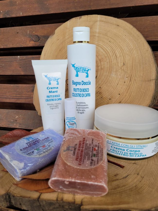 Prodotti con colostro di capra e piccoli frutti aziendali. Il colostro è un prezioso alleato della pelle, aiuta a combattere le rughe, le smagliature e migliora l’aspetto delle cicatrici. CREMA VISO, CREMA CORPO, CREMA MANI, BALSAMO LABBRA, BAGNO DOCCIA E SAPONETTA.